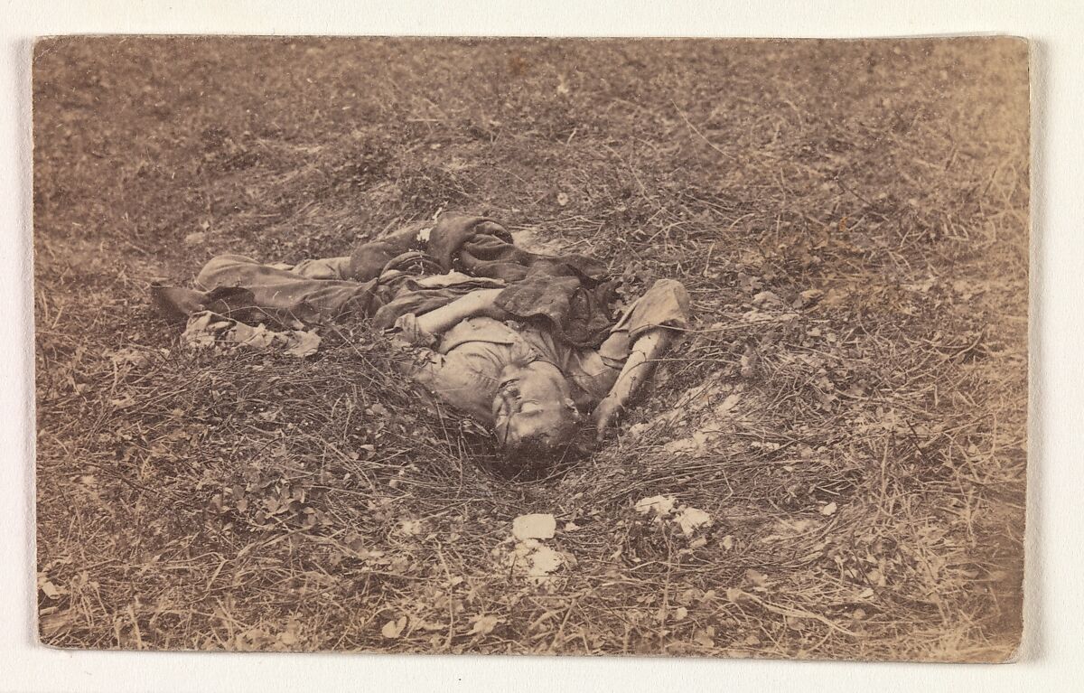 The Battle of Antietam (named after a creek near Sharpsburg, Maryland) occurred on September 17, 1862, and was known as the "bloodiest single day of the war." More than 26,000 soldiers on both sides were wounded or killed, including this Confederate soldier, who, according to the caption added by the Mathew Brady studio, "after being wounded, had dragged himself to a little ravine on the hillside, where he died." It is generally agreed that Brady and his photographers, who at this time still included Alexander Gardner, repositioned some of the recently dead at Gettysburg, and one may question the ultimate, artful arrangement of this Confederate soldier as well. With or without the physical intervention of Gardner, the photograph remains a heartbreaking testament to the victims of war. The image was published by Brady as a carte-de-visite-a small, inexpensive, and extremely popular format for portrait photographs during the 1860s and 1870s.