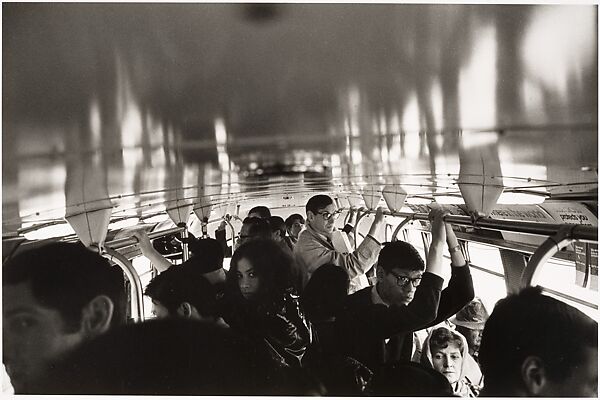 Mayes is recognized for her photographs from the late 1960s of the Monterey Pop Festival, a milestone for that era’s counterculture and a highlight of the "Summer of Love." She also produced portraits of the young people that flocked to San Francisco’s Haight Ashbury District and explored the relationship of people to the landscape, focusing on the quintessentially American experience of viewing the world from a moving automobile. Here Mayes captured an everyday experience from an unexpected viewpoint, allowing arches of light and shadow to create an ethereal glow above the heads of commuters.