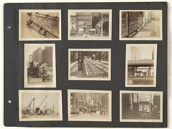 In 1921 Ohio-native Abbott left New York to study in Paris. Returning to the city in 1929, she found it transformed and ripe with photographic potential. Following the model of the French photographer Eugène Atget, whose street views of Paris she admired, Abbott ventured around New York photographing seemingly incidental, but often profound, scenes that captured the city’s changing character. This page of small-scale photographs is one example of many of similar album pages in the Metropolitan’s collection. Assembled by Abbott, the album from which they derive comprised a kind of photographer’s sketchbook for subjects and themes.