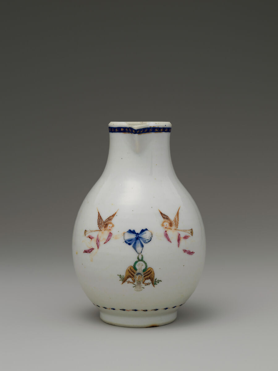 This cream pitcher features a polychrome decoration with the badge of the Society of the Cincinnati in colored enamels.