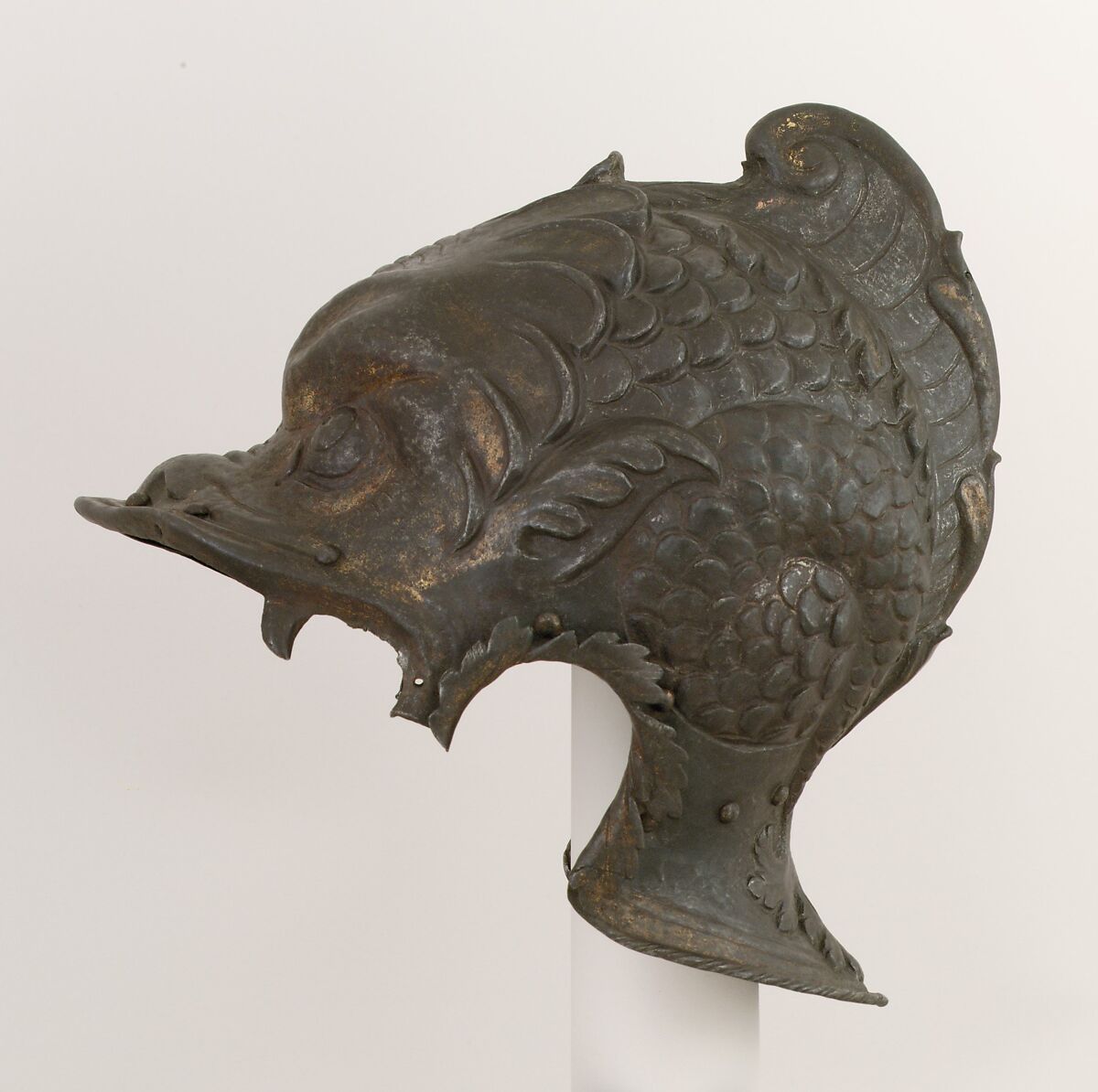 Classically inspired helmets embossed in high relief, sometimes in the form of fantastic beasts, were a specialty of Milanese armorers in the 1530s and 1540s. Unlike etching, embossing thinned and weakened the steel and compromised its deflective qualities, so the technique generally was limited to armors intended for ceremonial wear. While this burgonet falls far short of the high standard of modeling and finish typical of works by Filippo Negroli (ca. 1510–1579) or his cousin Giovan Paolo (ca. 1513–1569), the leading masters of armor all'antica ("in the antique manner"), it nevertheless remains a characteristic example of this classicizing Renaissance art form. The helmet is forged from a single plate of steel, the surfaces retaining only faint traces of the original fire-gilding and silver damascened details.