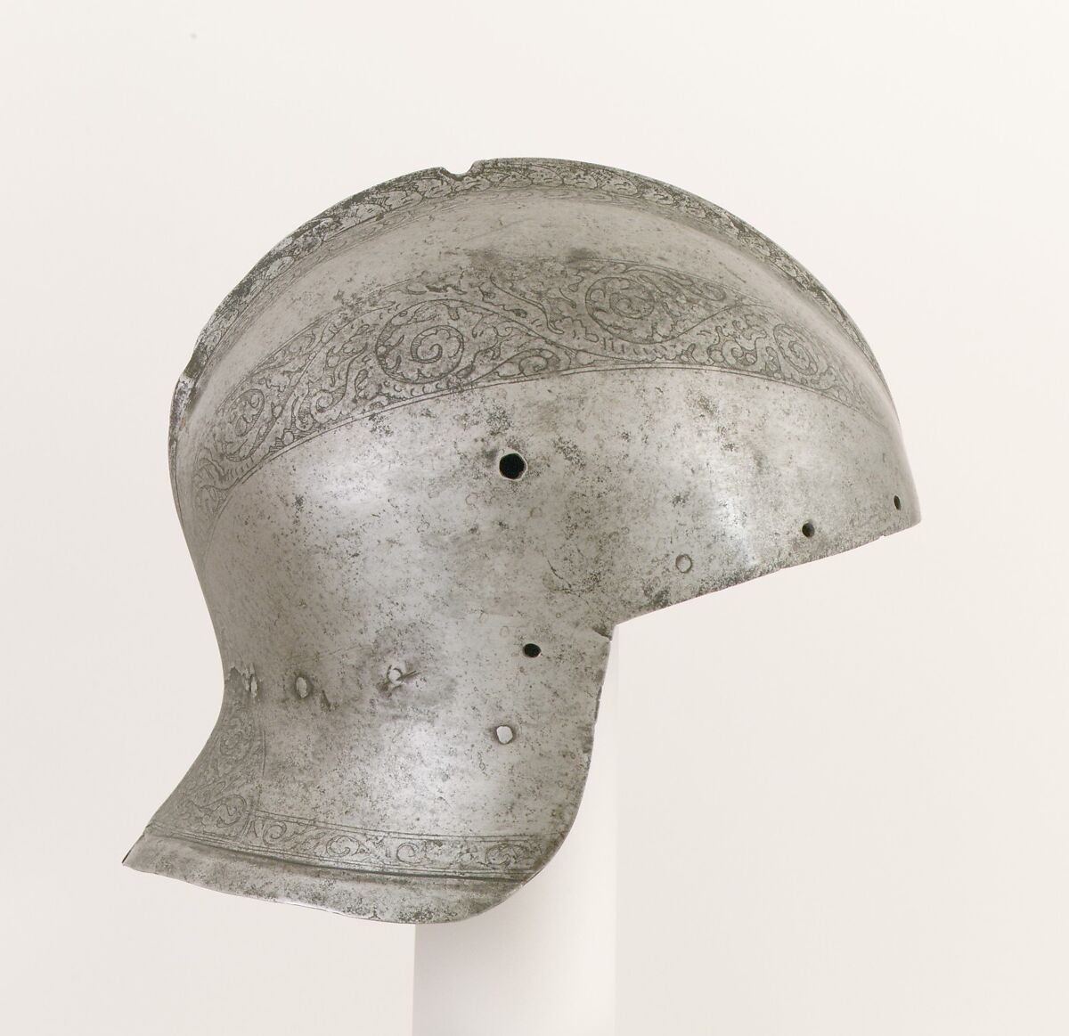 Etching with acid is known to have been used for the embellishment of weapons since at least the thirteenth century, but the technique seems to have been applied to armor beginning in the late fifteenth century, several decades before it was adopted as a printmaking technique. Formerly gilt, the etched decoration on this example includes bands of foliage set against a diagonally hatched background. Similar ornament is found in contemporary Italian prints. The sallet was probably fitted with a large bellows visor pivoting at the sides and was intended for use by a light cavalryman.