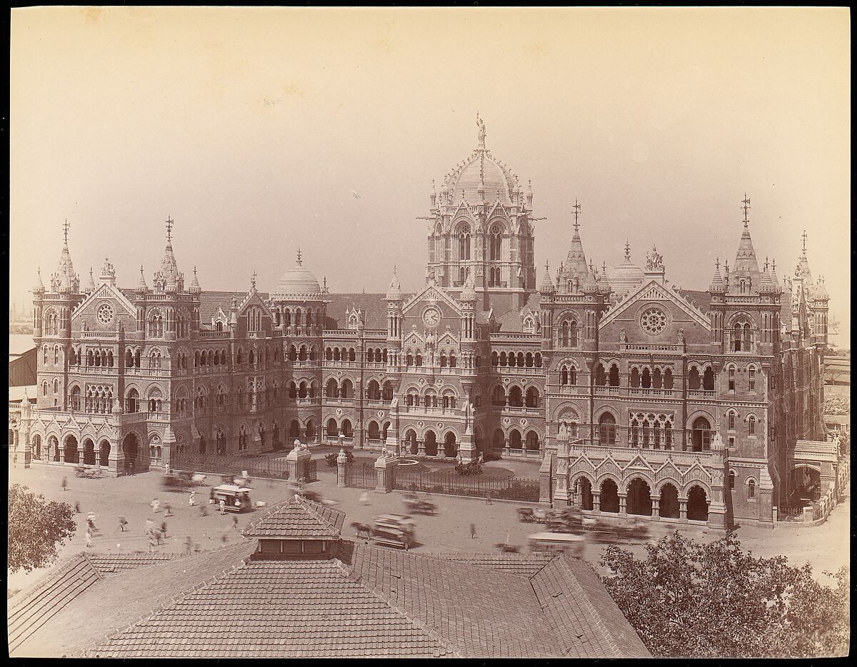 Frederick W. Stevens designed this building for the Great Indian Peninsular Railway, to serve as its main train station in Bombay. The style combines the Venetian Gothic popular in England at the time with elements of Indian architecture, and is built in the local red sandstone. A thirteen-foot personification of Progress, raising her arm toward the skies, tops the central dome. The Terminus opened in 1887 in time to celebrate Queen Victoria's Golden Jubilee.