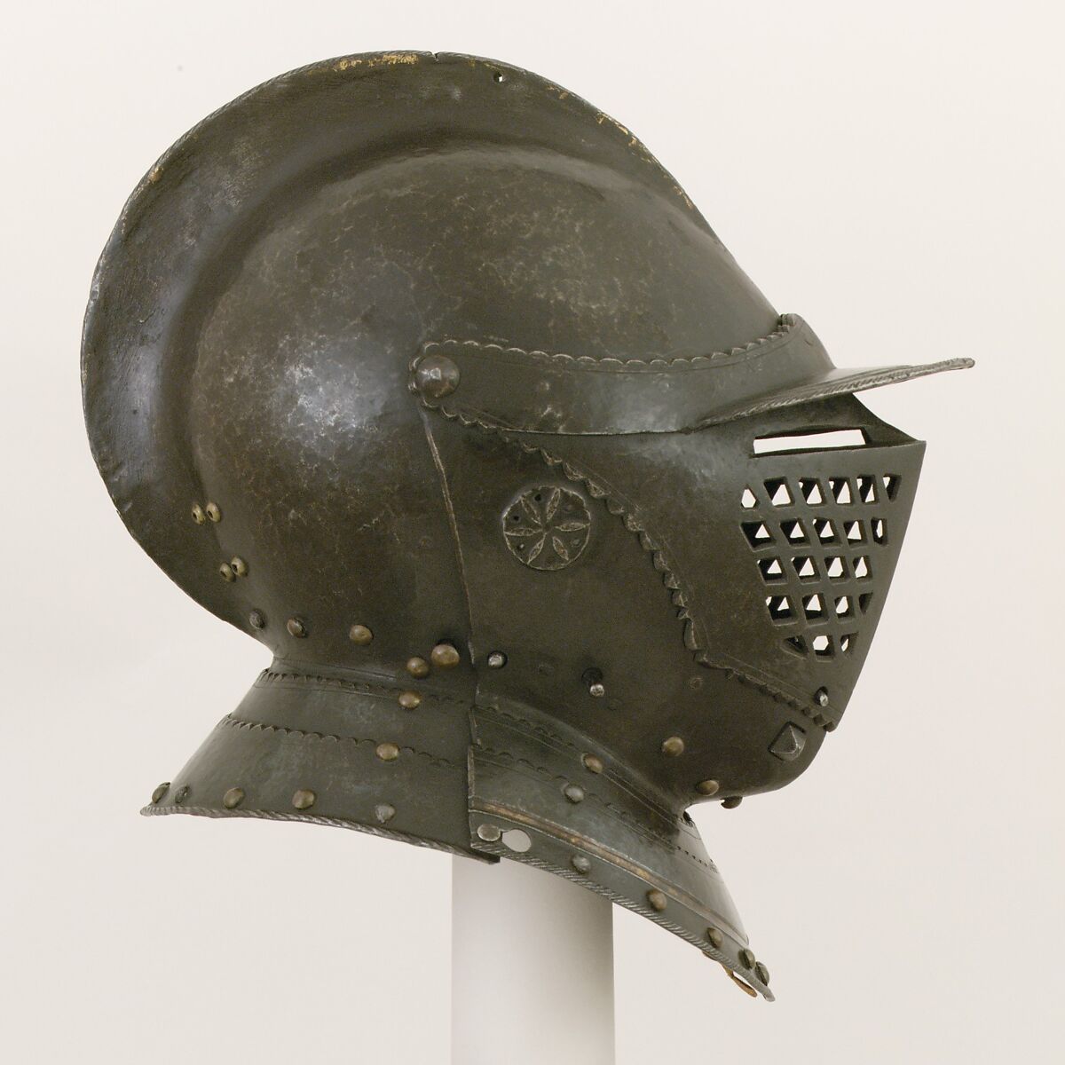 The openwork visor, which allowed maximum ventialtion while providing excellent protection from cuts, originally could be closed by a falling buffe (now missing), which fitted over the pierced studs on either side of the bevor. The elegantly shaped bowl and scalloped edges of the plates recall Innsbruck armors made in the 1550s and early 1560s. (The rear collar lames are old but associated.)