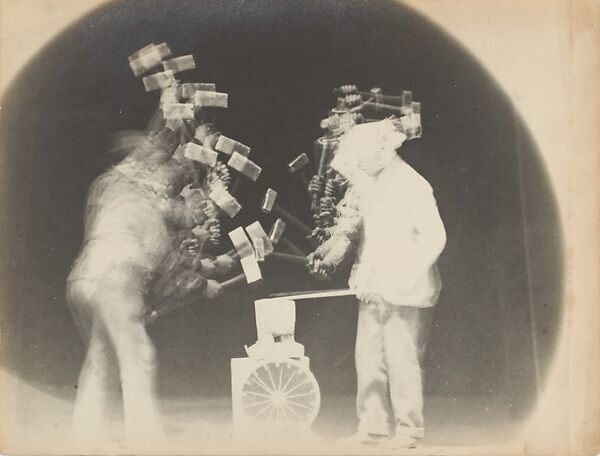 Unlike the motion studies of Eadweard Muybridge, who depicted movement as a series of discrete moments on separate, sequential negatives, Marey's analyses of motion are characterized by multiple exposures on a single photographic plate. In this photograph, Charles Fremont, a civil engineer who assisted Marey in his laboratory, used Marey's method to study blacksmiths at the anvil; the dynamic synthesis of their arced blows traced the pattern of manual effort involved in the task. Fremont's photographic investigations into the conservation and expenditure of energy during human labor established principles that laid the foundation for modern industrial production.