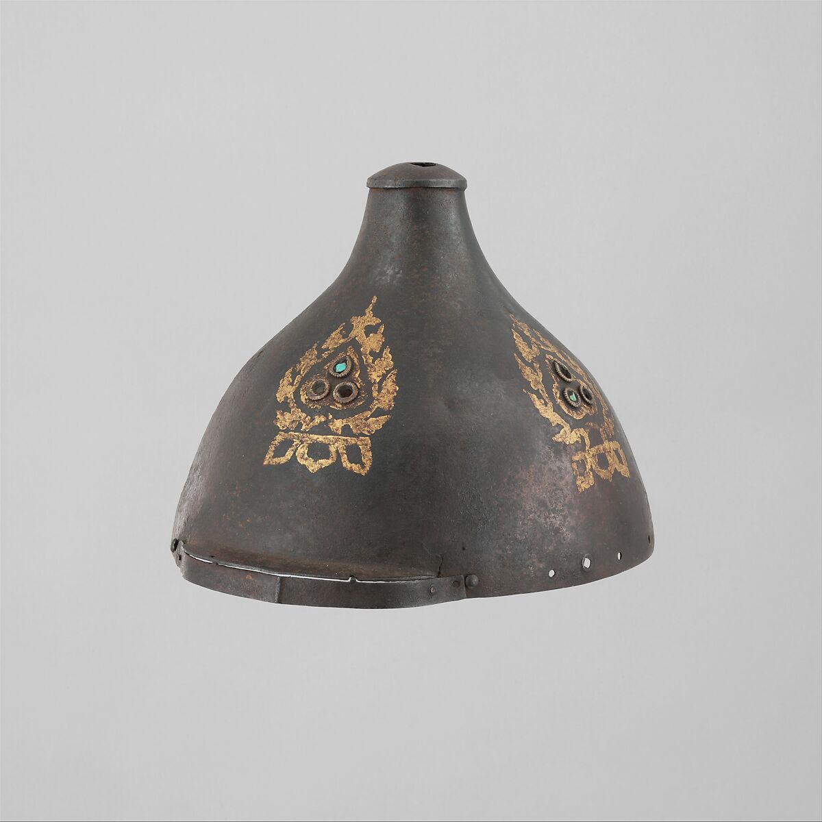 This extremely rare type of helmet is damascened in gold with a design known as the Three Jewels, a popular Buddhist motif representing Buddha, Dharma (Buddha's teachings), and Sangha (the community of believers). The solid construction of the helmet combined with the gold decoration indicate that this was a practical battle helmet, but made for someone of relatively high rank, who was probably a Mongolian follower of Tibetan Buddhism.
