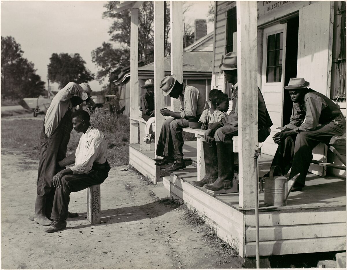 - Title: [Haircutting in Front of General Store and Post Office on Marcella Plantation, Mileston, Mississippi]