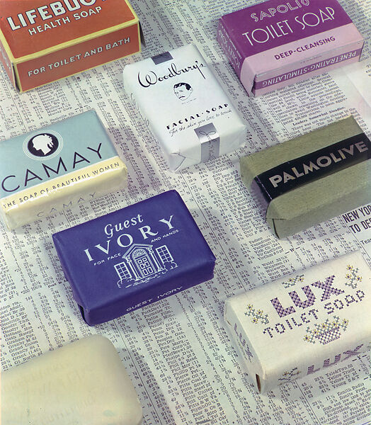 If mouthwatering soap seems a contradiction in terms, commercial photographer Ralph Bartholomew Jr. confounds the senses with eye candy to rival the confections nearby. Photographed two decades later, this work did not depend on paint for its delectable palette. It is an example of the early carbro process—a complex tricolor printing technique that gained popularity in the 1930s, as art directors courted Depression-era audiences. Brilliant color is essential here, in a photograph likely commissioned to sell not the soap but its packaging. Marketed to producers in an array of trade publications (including Modern Packaging, and the industry-specific standby Soap), fine paper wrappers were a booming industry unto themselves. Here, Bartholomew parades his bedecked bars across a page of newsprint showing stock prices to suggest that in this market, even cleanliness was a commodity.