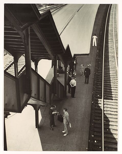 The structure of this picture brilliantly joins the traveler's descent down the stairs and the train's anticipated advance along the track. The wait is neatly figured by the man in white planted like a clothespin between the zigzag path of arrival and the vertical zip pointing toward the trajectory of future travel.