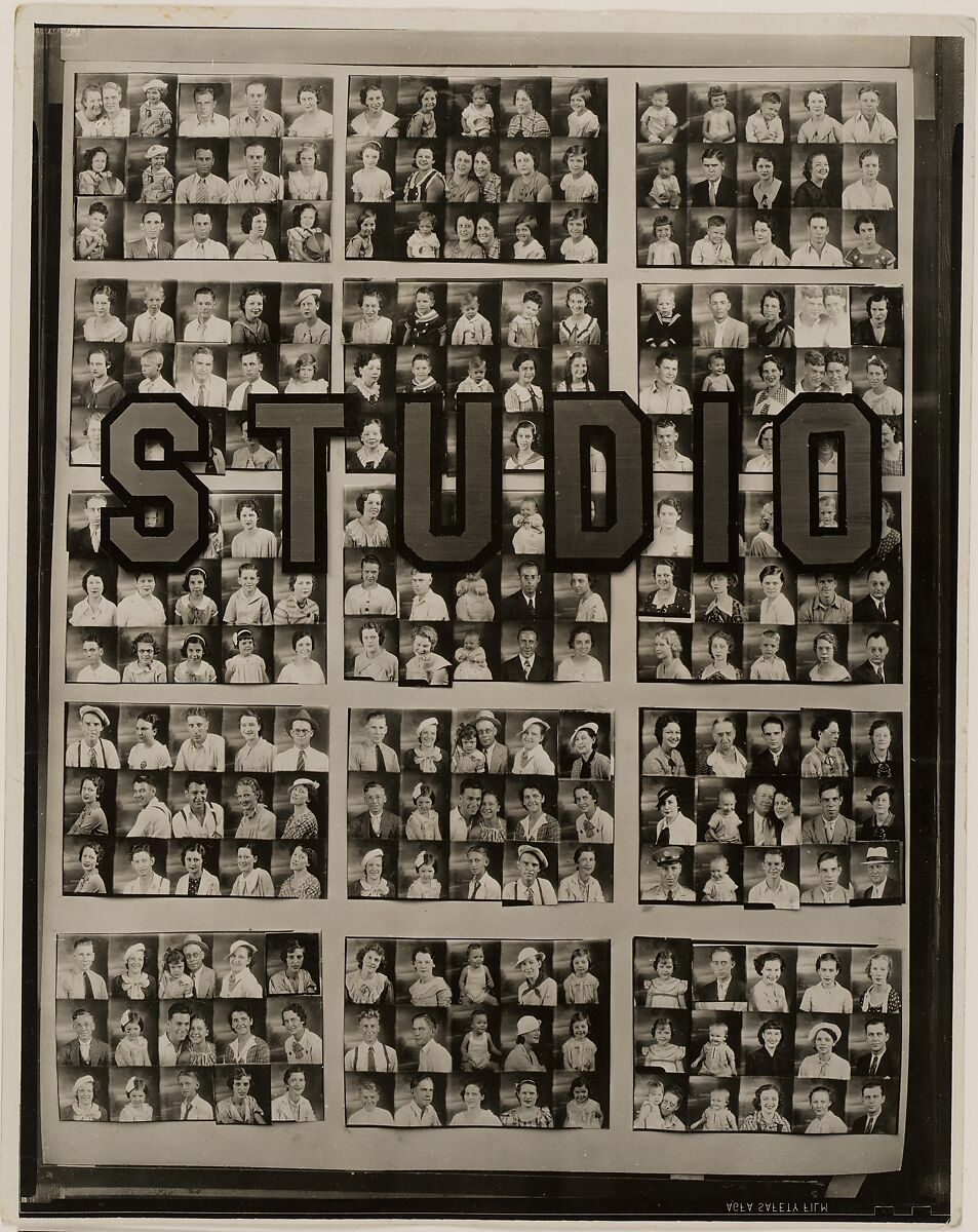 This picture is a composite portrait of a slice of society. It represents the window display of an anonymous portrait photographer in the South during the Depression. He was evidently not much of an artist but was good at pinching pennies, eager for business, and proud of his trade. On each of his large negatives he managed to make fifteen individual portraits. He thought most exposures good enough to use in this advertising display but covered his occasional failures with more successful images cut from other contact sheets.
