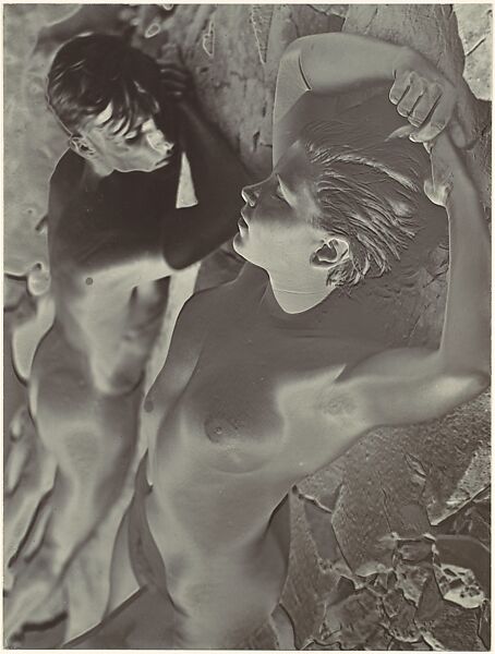 When a print is solarized during development, the areas of photographic tone reverse along its edges. By using this technique, Kesting made the bathers' bodies appear incandescent. His nonsolarized prints from the same negative do not evoke the penetrating heat of the sun so viscerally.