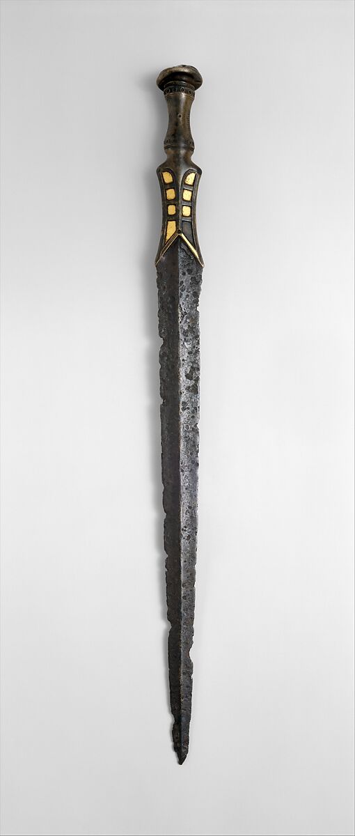 From its inception in the third millennium B.C., the sword served equally as a weapon and as a symbol of social status and power. During the first millennium B.C., in the hands of the nomadic peoples of the Eurasian steppes, it became, along with the bow, one of the primary cavalry weapons of the ancient world. Groups such as the Scythians, the Yuezhi, the Xiongnu, and the Xianbei achieved a succession of federations and kingdoms in Eurasia by combining the use of sword and bow with an unparalleled skill in horsemanship. Archaeological investigations of burial sites have established the importance of the sword both as a valued possession and a sign of rank in various nomadic societies. While burial context has made it possible to identify some types of swords with specific nomadic peoples, others, like this example, are difficult to attribute with certainty. The complex techniques required for the manufacture of this sword, the combined use of bronze and steel, and the presence of gold decoration all indicate its origin in a society with advanced metalworking skills and a relatively high level of material wealth. Swords similar to this one have been found in Yunan in southwestern China and in Ningxia in the northwest. The Ningxia finds also include many other examples of similarly advanced metalworking, suggesting that this sword may have originated in that region, perhaps around the time of the late Warring States period.