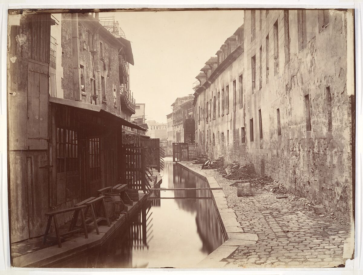 Although we may now look back at pictures like this one with nostalgia for a lost Paris, to Marville and his audience such scenes evoked a less bucolic reality-the Bièvre was essentially a waste system for twenty-four tanneries, twenty-one leather factories, nine starch and three dye manufacturers, a paper mill, two cotton and two flour mills, four laundries, a soap and candle factory, and assorted other industries. Shortly after Marville made this photograph, the Bièvre was simply covered over and tied into the Paris sewer system.
