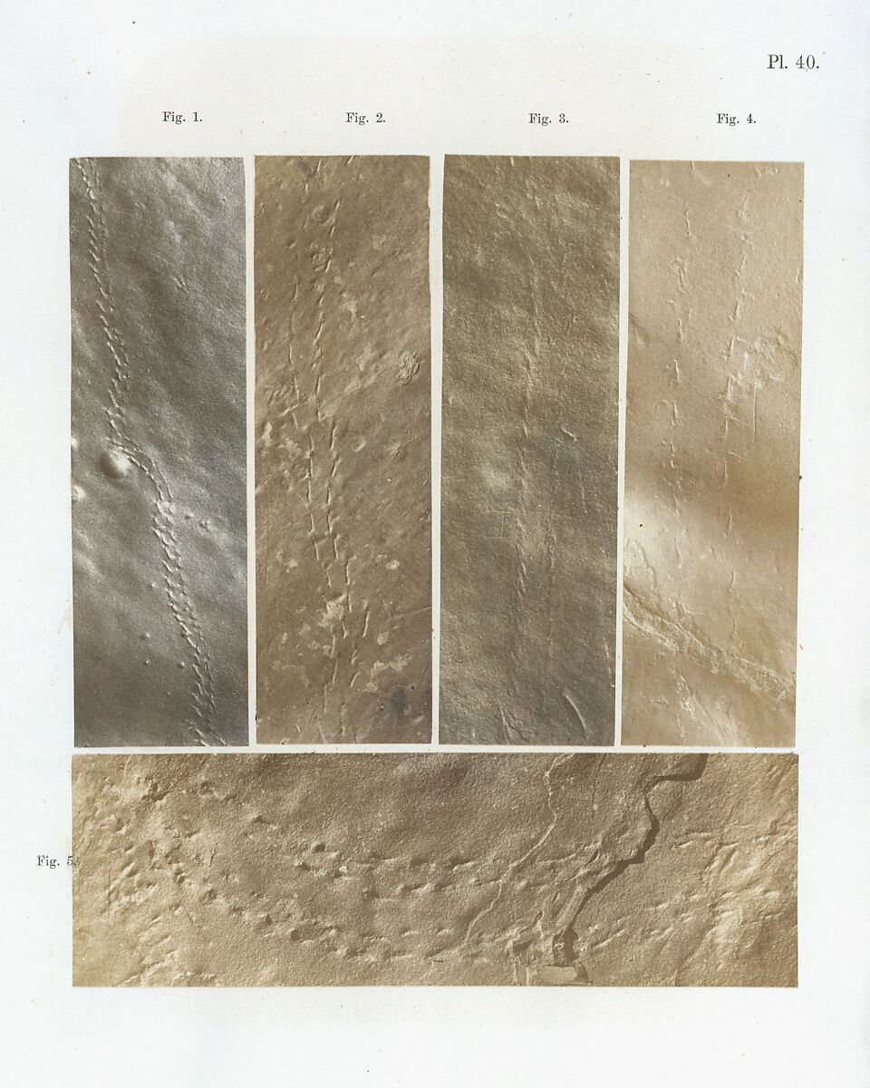 James Deane, a surgeon from Greenfield, Massachusetts, began his work in ichnography (ikhnos, from Greek, meaning "track" or "trace;" graphia, from Latin, meaning "to draw") when fossils were discovered in sandstone mined from a nearby quarry. "Ichnographs from the Sandstone of Connecticut River," the "crowning labor" of Deane's life, contains drawings by Deane, as well as salted-paper prints made by an unknown photographer working under Deane's direction. Illustrated books on natural science were consumed by a wide audience and were appreciated as much for their elaborate illustrations as for the scientific knowledge they conveyed. In the introduction, the author describes the photographs themselves as "exquisite specimens of art." "Ichnographs" was one of the first books published in America to be illustrated with photographs.