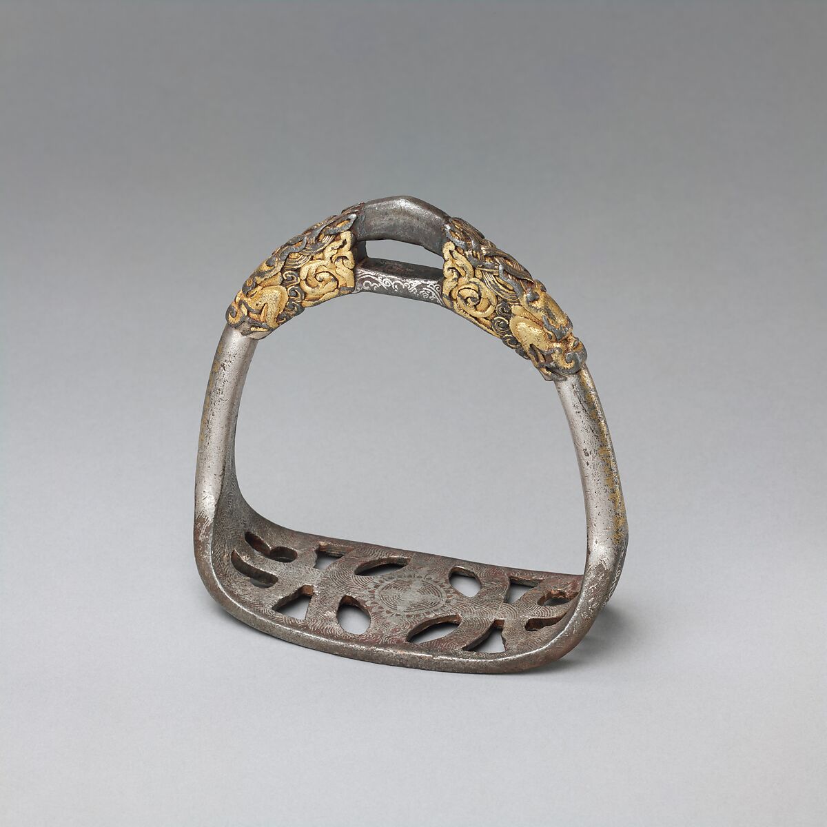 The form of this stirrup, with its peaked arch and rounded bottom corners, is distinctively Tibetan, as opposed to the more typical styles that were derived from Mongolia and China. The design damasened in silver in the center of the pierced tread represents the Wheel of Law, a symbol frequently found on Tibetan objects.