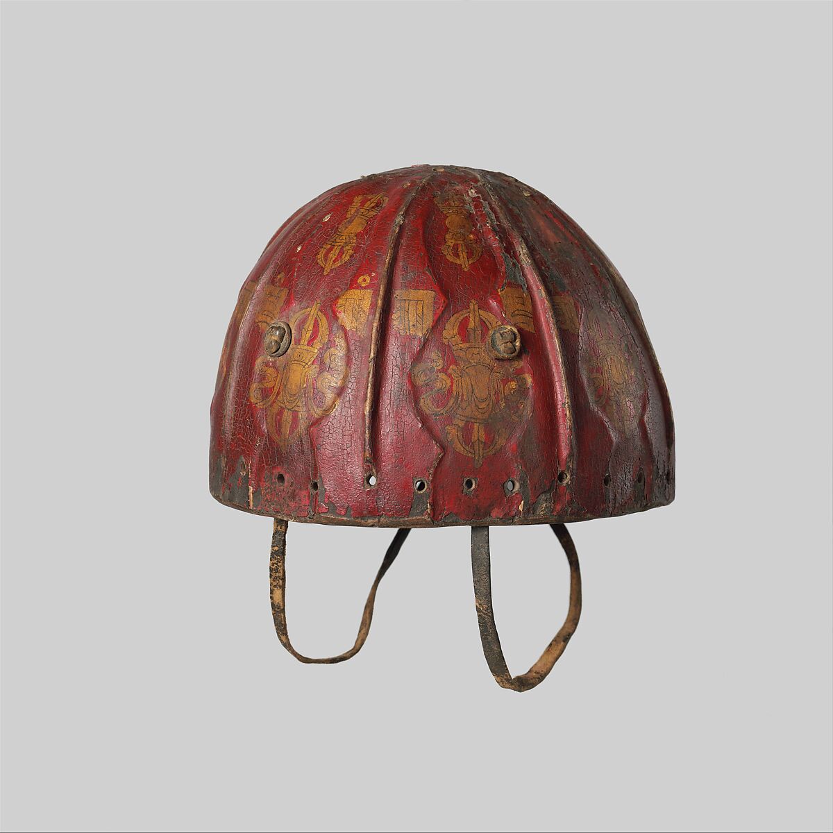 One of the few surviving examples of its kind, this helmet, made of two halves of molded leather, imitates an iconic form of Tibetan helmet comprising eight overlapping iron plates joined together by leather laces. Its red surface is decorated with vajras and sixteen seed syllables forming the repeating mantra "Om ah hum." Red leather armor is an attribute of several deities, including the dharmapala Chos skyong bse khrab pa, whose name literally means "leather-armored dharma protector." While its vajras and mantra imbue this helmet with potent spiritual protection it is also a practical piece of defensive equipment. The use of hardened-leather armor is documented in regions that were culturally Tibetan for at least one thousand years, from the eighth or ninth century into the nineteenth.