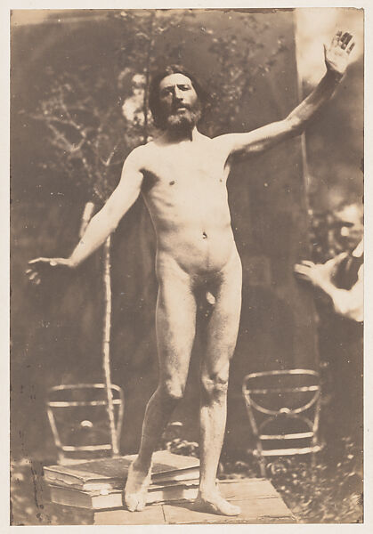 Marlé’s photograph was probably intended as an aid for painters and sculptors. The jury-rigged arrangement of podium, books, and potted tree, as well as the painting held in the background by a studio assistant, may strike the modern viewer as an incongruous contrast to the heroic gesture of the model. Marlé and those who bought his photograph, however, would have been absorbed by the grand academic pose and likely would have thought the awkward accoutrements of little consequence.