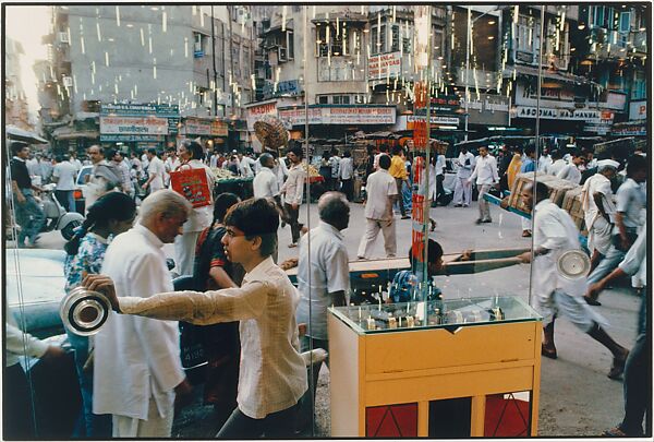 Born into an aristocratic family in Jaipur, India, Singh lived and worked in Paris, London, and New York, but his lifelong subject as a photographer was the vibrant culture and landscape of modern India. With its emphasis on visual surprise and spontaneity, Singh's work belongs to the tradition of small-format street photography pioneered by such artists as Henri Cartier-Bresson and Robert Frank. Unlike many of his European counterparts, however, Singh worked exclusively in color, often composing his images with a graphic complexity akin to that of Mughal miniatures. In this view of a busy intersection through a plate-glass window, the artist vividly captures the surging energy and functional mayhem of Bombay, India's Mayanagri, or City of Wealth.