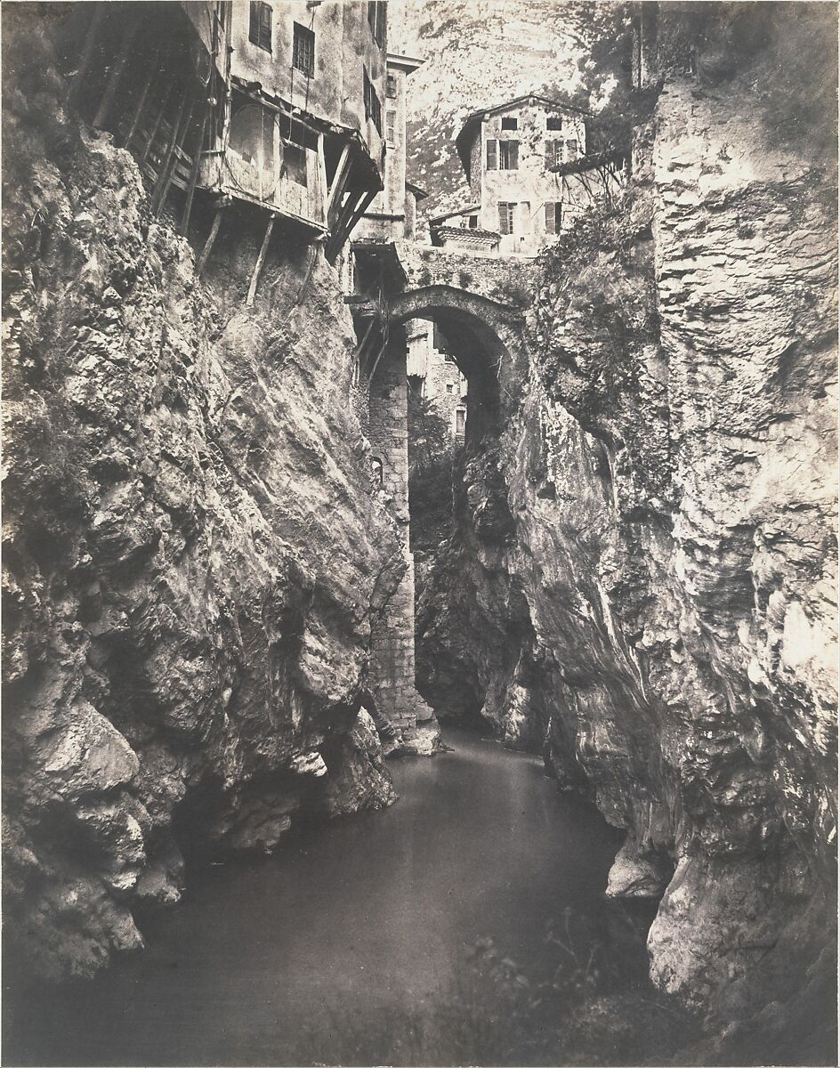 The cliff-bound town of Pont-en-Royans-where residents lowered buckets and nets into the river from their cantilevered houses-was a well-known destination for those visiting the picturesque sites of France. Baldus pushed the town to the very top of his picture and banished the horizon altogether, focusing on the rough rock surfaces of the ravine with a realism rivaled only by Courbet.