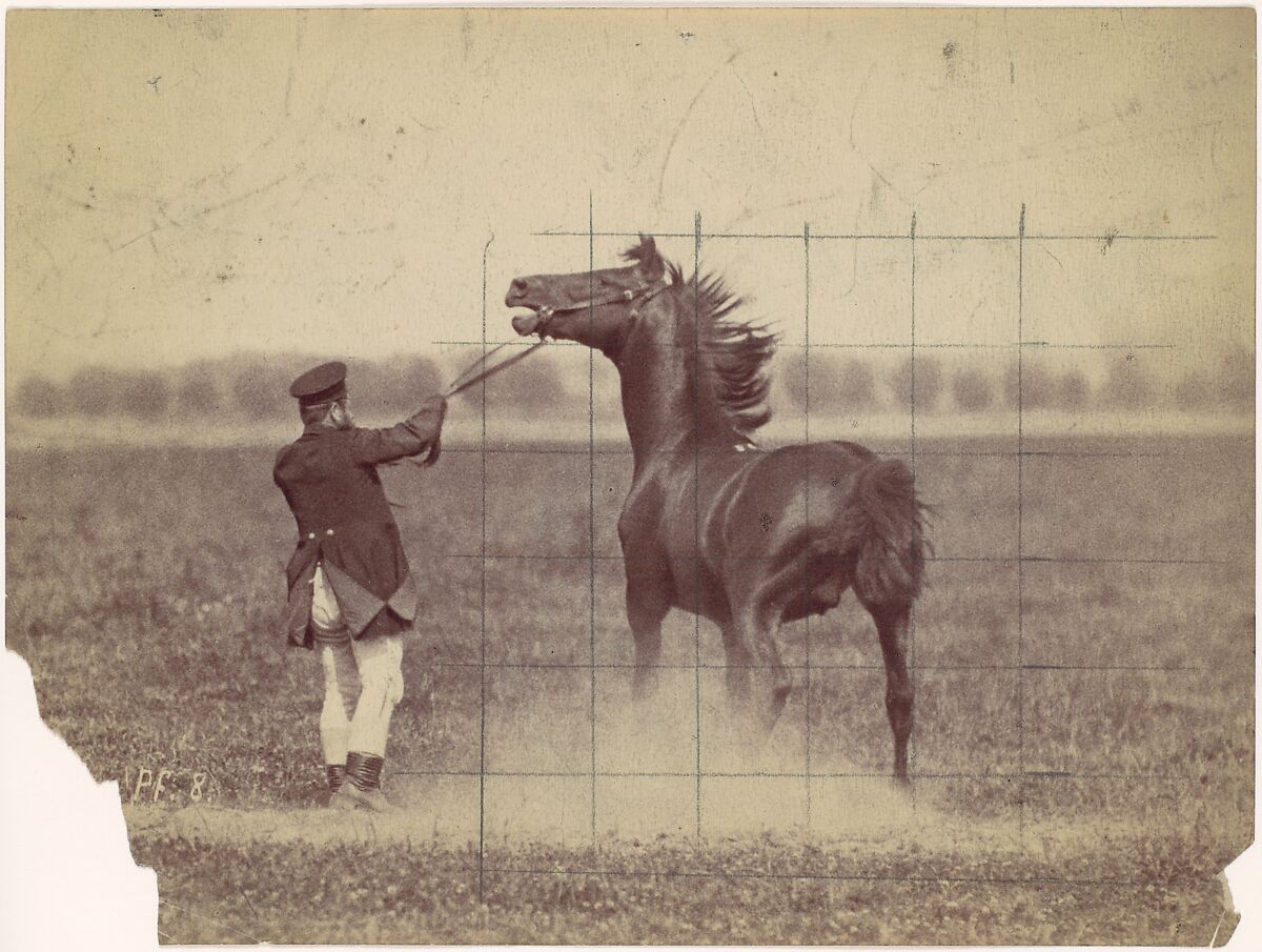 In the last quarter of the nineteenth century, photographers and scientists became interested in arresting action on film. Their studies revealed movement beyond what the human eye could see. One of the most skilled innovators in the field was Ottomar Anschütz, whose detailed photographs of animal locomotion caught the attention of the German government. Commissioned by the War Ministry, Anschütz recorded horses and their riders at the elite Military Institute in Hannover. This photograph of a soldier reining in his steed, its untamed mane frozen in midair, was previously in the collection of the Catalan muralist Josep Maria Sert. The grid that Sert added to the photograph indicates he may have used it as a reference for his artwork.