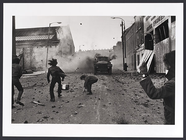 Here, Peress captures a riot on William Street in Derry, a ritual site of confrontation between the Irish and English that would become forever infamous after the events of "Bloody Sunday," January 30, 1972, when British troops sprayed tear gas and opened fire on demonstrators. Through its taut immediacy and powerful sense of the opposition between machine and man, the photograph is an iconic depiction of modern street warfare.