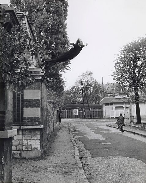 As in his carefully choreographed paintings in which he used nude female models dipped in blue paint as paintbrushes, Klein's photomontage paradoxically creates the impression of freedom and abandon through a highly contrived process. In October 1960, Klein hired the photographers Harry Shunk and Jean Kender to make a series of pictures re-creating a jump from a second-floor window that the artist claimed to have executed earlier in the year. This second leap was made from a rooftop in the Paris suburb of Fontenay-aux-Roses. On the street below, a group of the artist’s friends from held a tarpaulin to catch him as he fell. Two negatives--one showing Klein leaping, the other the surrounding scene (without the tarp)--were then printed together to create a seamless "documentary" photograph. To complete the illusion that he was capable of flight, Klein distributed a fake broadsheet at Parisian newsstands commemorating the event. It was in this mass-produced form that the artist's seminal gesture was communicated to the public and also notably to the Vienna Actionists.