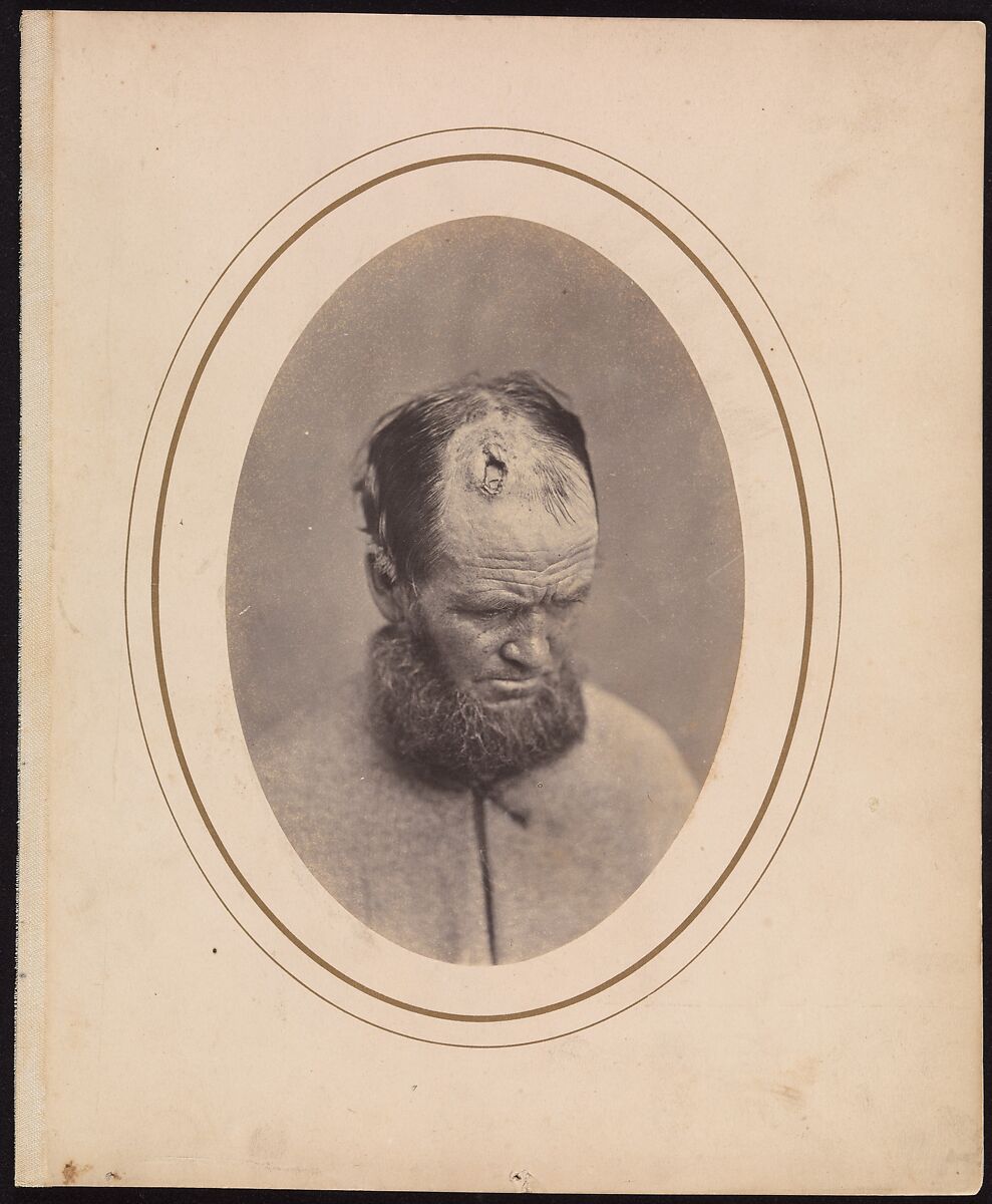 Union Private Parkhurst received a gunshot wound to the head at Farmville, Virginia, in the final weeks of the Civil War. The ball fractured the upper portion of the soldier’s front bone, and he was removed to Harewood Hospital. Dr. Bontecou’s printed notes on the reverse of his card-mounted teaching photograph reveal that Parkhurst was fifty years old and that after treatment at the hospital his health progressed favorably. “Doing well,” Bontecou observed. The portrait is a good example of how at times the surgeon used enlargements to bring attention to a specific wound and its treatment. In this case, studying his patient from above, he also created a sublime document of medical recovery and human introspection.