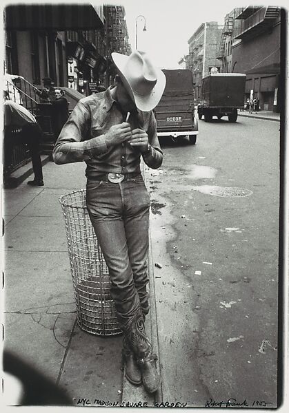 This photograph is one of the more benign, if jarring, images in Frank's watershed book, The Americans, published in America in 1959 (the book was originally published in Paris in 1958) to an outcry of public controversy. Half of the country felt that Frank had betrayed his adopted home, and half felt his criticism was not only warranted but necessary. What is clear is that the photographs pierced the core of a country saturated with complacency and not entirely comfortable with its world persona. As it happened, the cowboy in the city was a good metaphor for America on the world stage in 1955: the country had emerged victorious from World War II, saving the world for democracy; at the same time, it had done so by unleashing the most terrifying weapon ever invented. Moreover, its egalitarian political ideals were severely undermined by a growing intolerance for racial and ideological differences, which intensified in the Cold War climate of the 1950s. The hypocrisy of such a position was perhaps most apparent to recent émigrés like Frank. While the specific antecedents of this image are a matter of interpretation, this ten-gallon-hatted, plaid-shirted, jeaned, booted, and silver-belt-buckled Tex leaning against a wire garbage can in the middle of New York are an undeniably odd sight-although his self-absorbed preening may not be. It highlights Frank's talent for spotting camera-ready incidents that resonate far beyond the character's immediate significance.