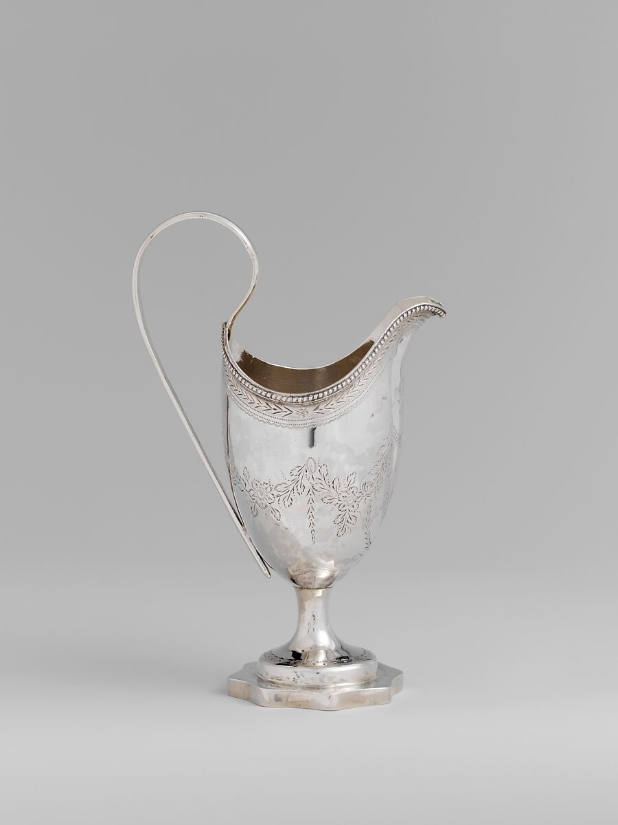 In the years following the American Revolution silversmiths favored such classical shapes as the covered urn and the inverted helmet, here represented by this creampot and its matched sugar bowl (23.80.23a, b). Each of these objects is finely engraved below its beaded lip with brightcut geometric borders and wrigglework and on its body with floral festoons and a bowtied shieldshaped medallion engraved with an interlaced monogram. The bowtied ribbons are particularly distinctive, their twists and turns carefully shaded and their ends precisely frayed. Although only the creampot is marked, the ornamental beading and identical brightcut engraving confirm that they were intended as mates. The original owner of this creampot is not known.
