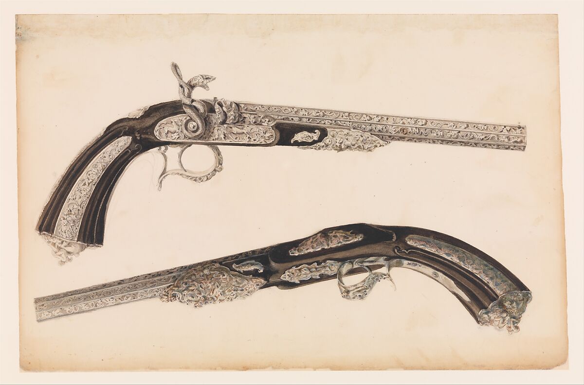 These designs are part of an album from the workshop of the Parisian gunmaker Louis-François Devisme (active 1833–1886). The album includes thirty-five original drawings, in addition to tracings and inked impressions ("pulls"), showing swords, parts of swords, firearms, and firearms ornament. Together they represent an eclectic mix of Renaissance revival, neoclassical, and Second Empire styles, all of which were popular in French decorative arts during the mid-nineteenth century.