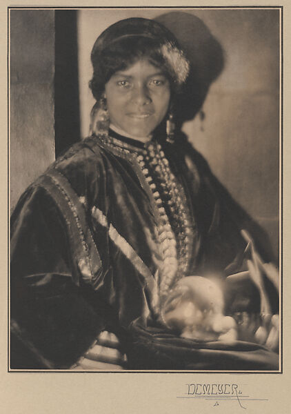 Shaped by the values of the Aesthetic and Arts and Crafts movements, and aiming for the acceptance of photography as a fine art, Pictorialist photographers such as de Meyer paid special attention to craftsmanship in the presentation of their work. Here, he affixed his large platinum print to layered colored paper and signed it with a flourish. The elaborate mount provides a fitting frame for an image that luxuriates in rich fabrics and shimmering light. The power of the portrait derives from the juxtaposition of “exotic” excess with the young woman’s forthright expression.