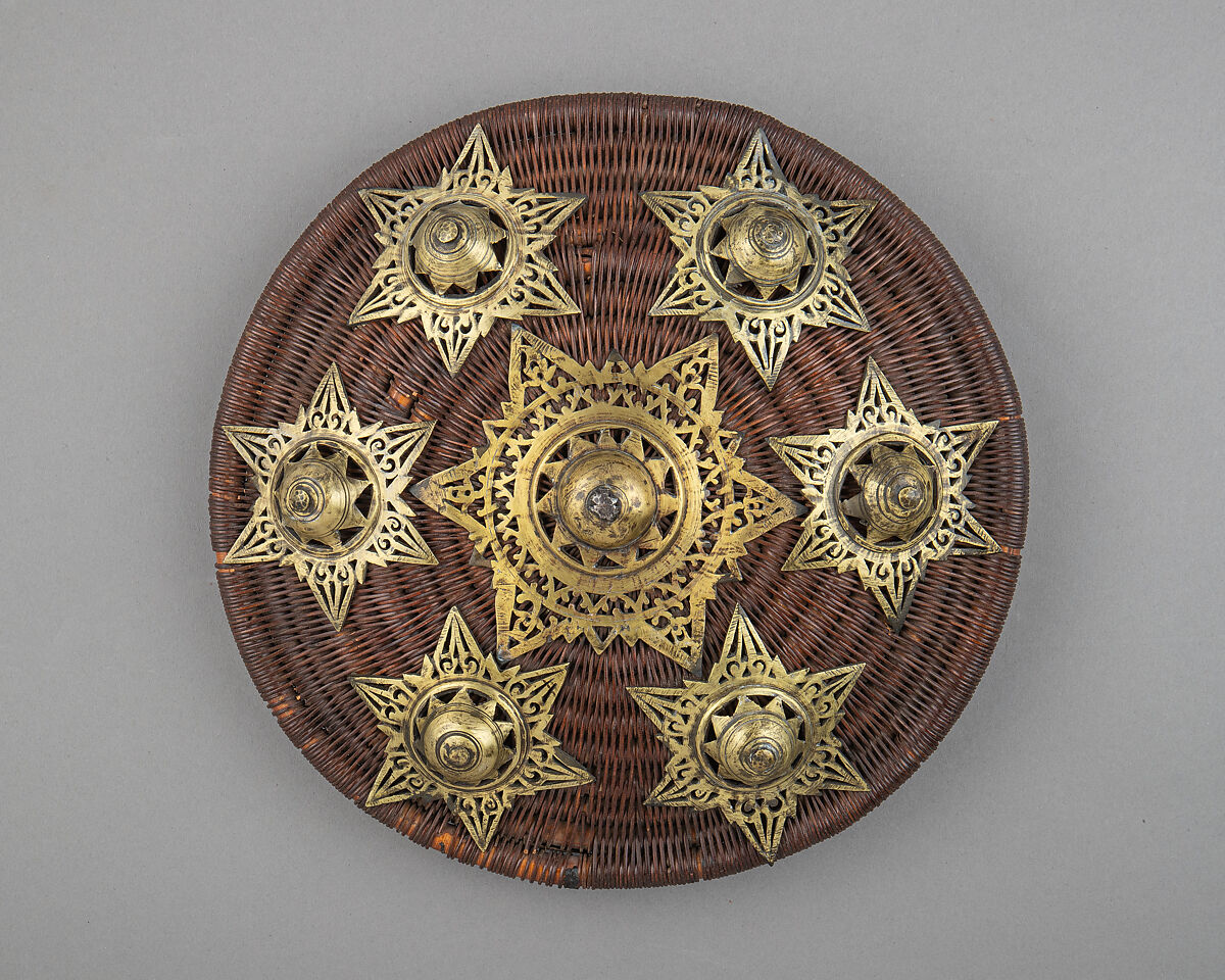 Sumatran peoples crafted shields for war and for ritual dance from a variety of local materials, including coiled and woven cane, as seen in the two shields here (acc. nos. 36.25.602, .620). Their surfaces feature geometric decorations that incporporate star-shaped brass mounts. Common to shields from Suamtra, the motif is thought to represent the seven stars of Ursa Major, also known as the Big Dipper.