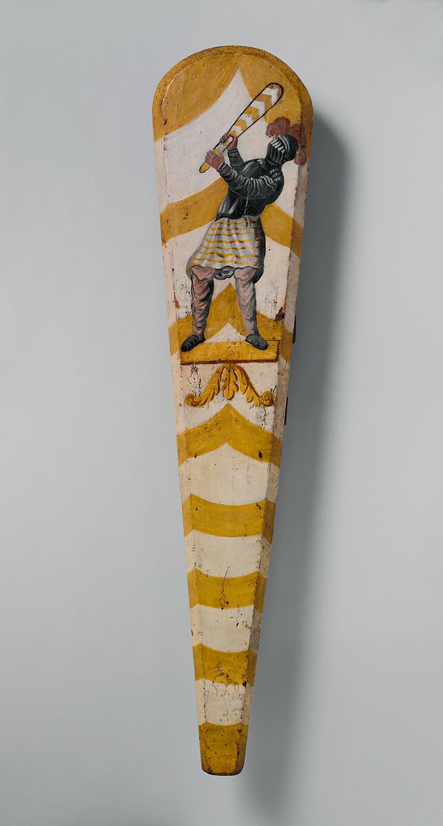 Each combatant in the gioco del ponte was equipped with a targone, a sturdy clublike shield that was unique to the event. The shields were decorated with the insignia of the squadrons that took part in the mock combat or, in rare instances such as this, with an image of a fully armed contestant.
