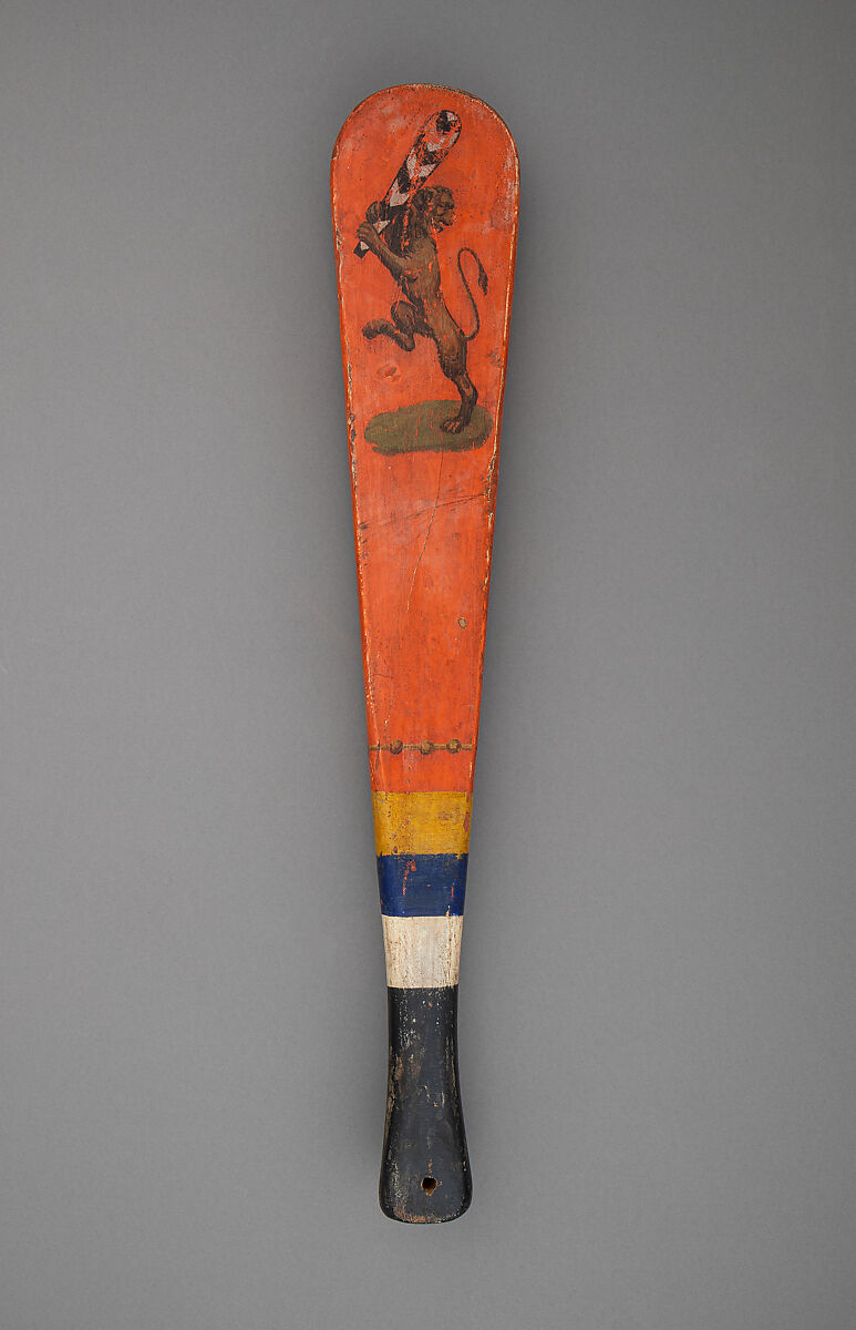 This group of unusual armor and weapons (acc. nos. 14.25.770, .771; 29.30.2; 2012.134a, b) demonstrates the enduring versatility of the shield. They were used in a mock combat known as the Gioco del Ponte, held in Pisa sporadically from medieval times until 1807 and briefly revived in the 1930s (the date of the painted decoration). In a fight for control of the Ponte di Mezzo bridge, teams wearing helmets and breastplates used the wood targone as both shield and club. The distinctive forms are unique to the event. Decorations include the insignia of the wearer's squadron and images of the participant using the targone to attack.