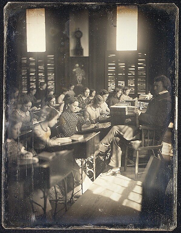 While the Boston partnership of Southworth and Hawes produced the finest portrait daguerreotypes in America for a clientele that included leading political, intellectual, and artistic figures, the firm also made a limited number of exterior and interior views outside their controlled studio setting. This daguerreotype shows the most prominent school for young women in Boston, established in 1823 by George Barrell Emerson, second cousin of the poet and philosopher Ralph Waldo Emerson.