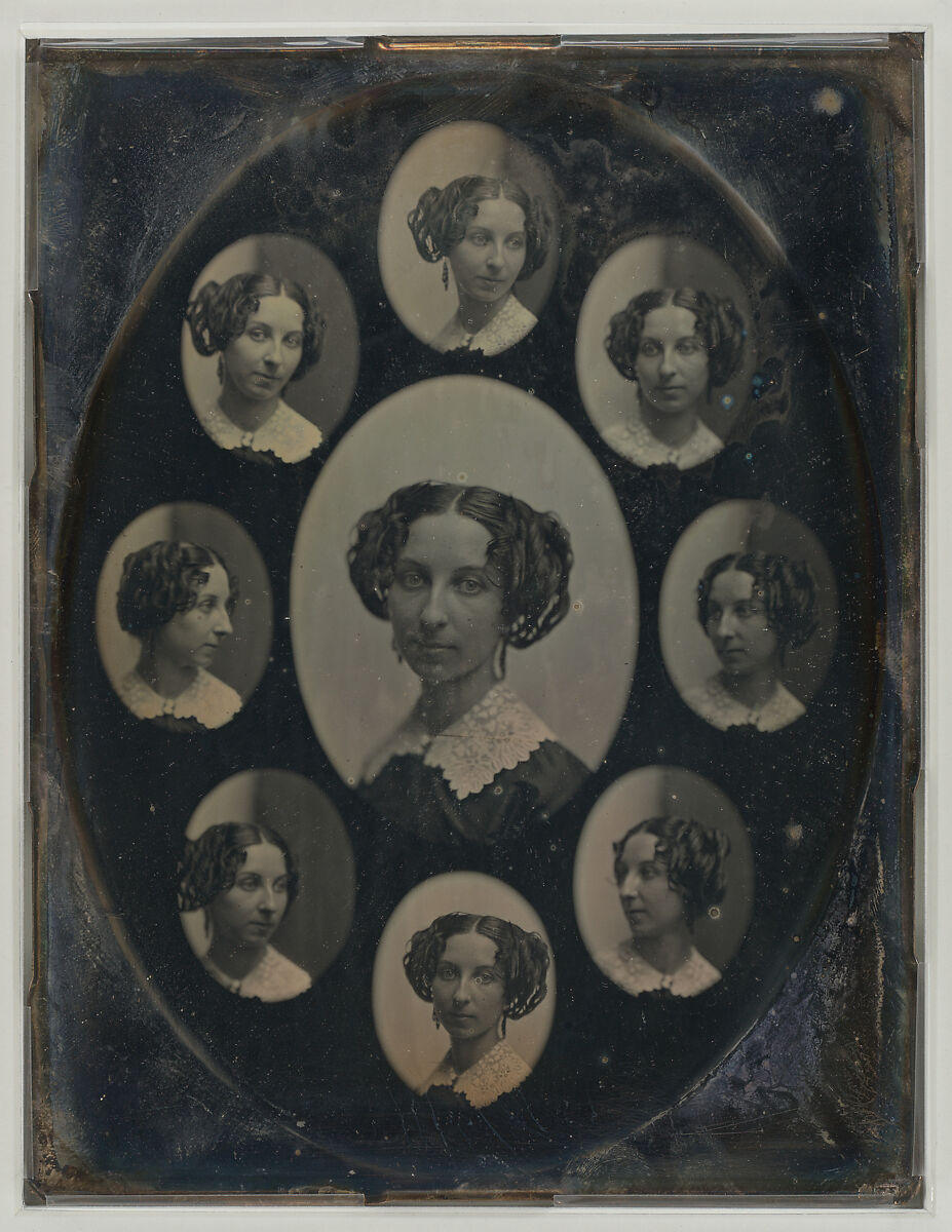 The Boston partnership of Southworth and Hawes produced the finest portrait daguerreotypes in America for a clientele that included leading political, intellectual, and artistic figures. This "medallion" portrait of an unidentified woman is a rare example of a difficult technique in which a sliding plateholder patented by Southworth was used to take eight sequential exposures on the same plate. The cyclical arrangement of the sitter's face suggests the phases of the moon from "new" to "full," an effect accentuated by the carefully bisected black and white background.