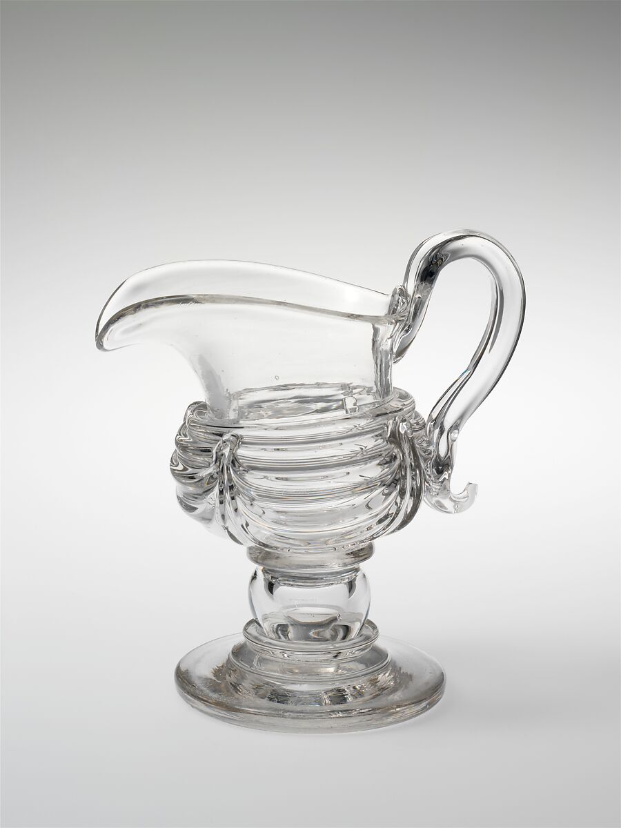 Glass, elaborately cut or engraved in a variety of patterns based on English Regency styles, was in vogue for fine tableware during the early nineteenth century. This elegant cream pitcher and its related sugar bowl reveal a sophisticated alternative to cutting: the manipulation of the clear, colorless glass in its molten state. The vessels combine multiple decorative techniques characteristic of three New England factories that were producing stylish wares during the 1820s and 1830s. The predominant feature is the tooled horizontal ribbing on a second gather, or applied layer, of glass, which was drawn upward into the ribs with a sharp tool to create a swag pattern. This striking ornamentation is repeated on the domed cover of the sugar bowl and again on the cover's finial. The bold, classic footed shapes and the rounded hollow stems are hallmarks of all three Massachusetts firms. Although lacking the refractive qualities of their cut-glass counterparts, the cream pitcher and sugar bowl are highly lustrous in their surfaces and sophisticated in their decorative techniques.