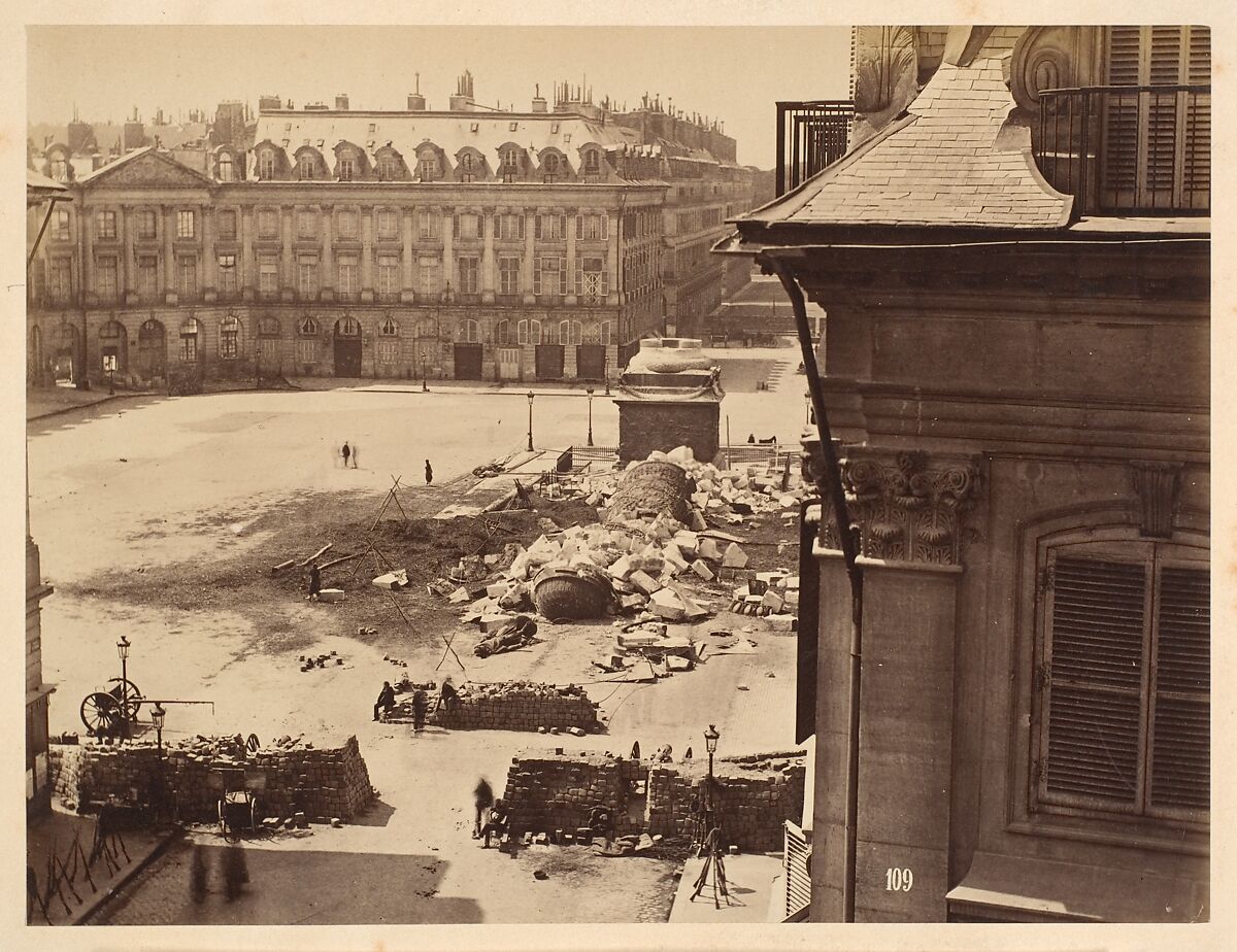 On May 16, 1871, a group of Communards led by the painter Gustave Courbet pulled down the Vendôme Column. In Franck's photograph its shattered remains litter the Place Vendôme.