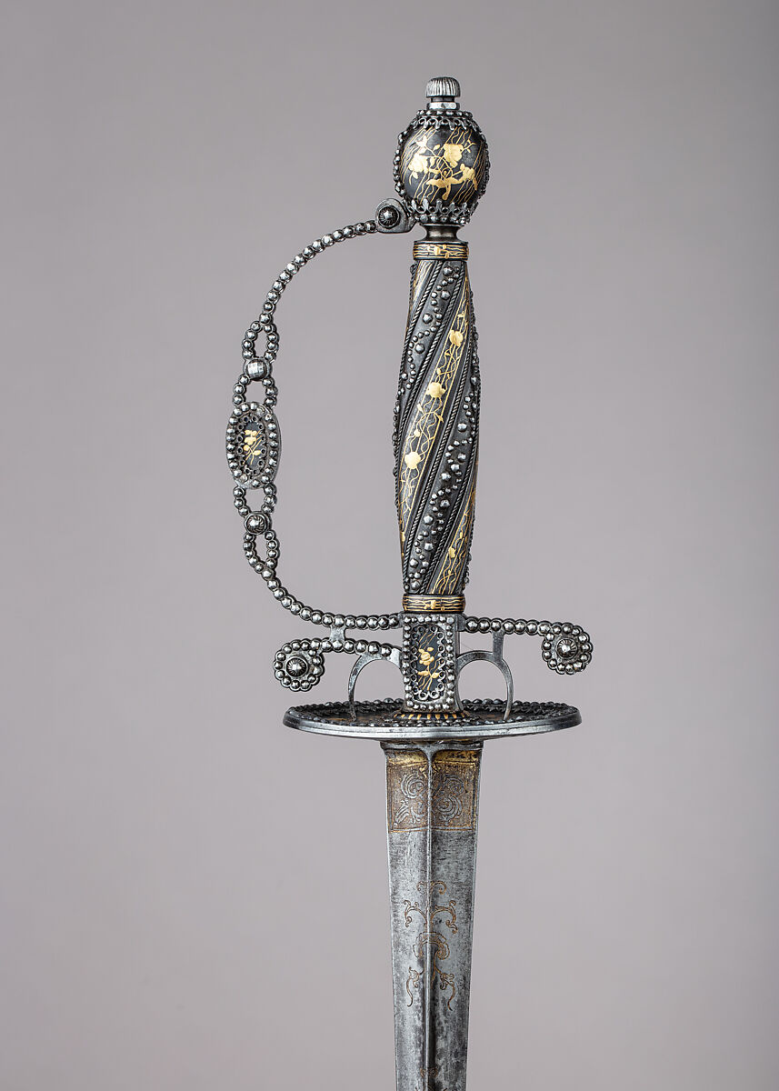 By the early seventeenth century, the rapier, a long slender thrusting sword, began to dominate as the gentleman’s weapon of choice. During the course of the century, however, as civilian fencing techniques became more specialized and refined, the rapier developed into a lighter, trimmed-down weapon known by about 1700 as the smallsword. Smallswords, often richly decorated, remained an integral part of a gentleman’s wardrobe until the wearing of swords in civilian settings went out of fashion at the end of the eighteenth century, at which time pistols were replacing swords as arms most frequently used in personal duels. The majority of smallsword hilts are made of silver or steel, but many also employ a wide variety of luxurious materials, such as gold, porcelain, and enamel. At their best, smallswords combine the crafts of swordsmith, cutler, and jeweler to create an elegant weapon that was also a wearable work of art.