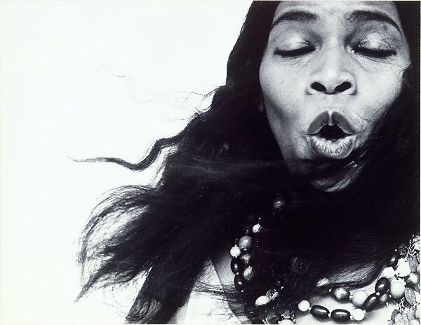 As the great contralto Marian Anderson closes her eyes to focus on the music, Avedon fixes ours on her. She sings the Giuseppe Verdi piece she had performed months earlier at the Metropolitan Opera, when she became the first Black singer to take its stage. The photographer’s studio is sterile by comparison, but the white background—an Avedon trademark—trains attention on Anderson, accentuating the contour of her head and the tendrils of her hair. Though the photograph predates this exhibition’s group portraits, it anticipates the formal innovation of those works, particularly in its treatment of pictorial space. Avedon crops his subject such that she appears to burst forth from the frame—a choice he explained as "emphasiz[ing] the power and vitality" of Anderson’s art.