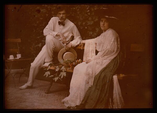 Eugene's strong painting background and expertise in printing were patently evident in the Pictorialist photographs he made beginning about 1894. In 1902, Stieglitz invited him to become a founding member of the Photo-Secession, and his facility with complicated photographic techniques such as the gum bichromate and autochrome processes, as well as his refined aesthetic sensibility, matched the artistic ambitions of the group perfectly. One of the earliest color processes, the autochrome was not only difficult but time consuming, requiring several stages of development and careful registration alignments; the final product was a colored glass plate meant to be seen illuminated from behind. Despite its challenges, Eugene mastered it and used it often, as here in this luminous scene depicting the founder of the Photo-Secession with his daughter.