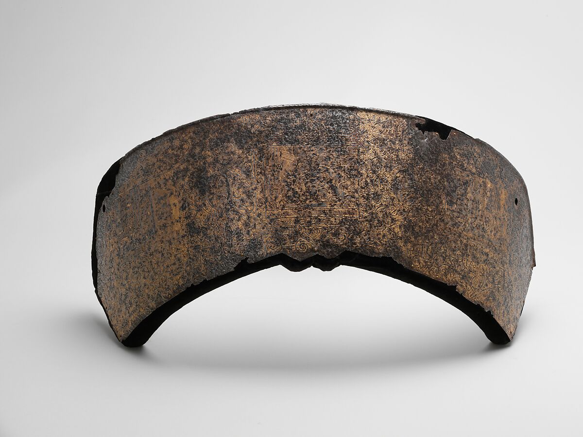 Strapwork, tracery, and arabesques were fashionable motifs in the decorative arts of the period and often appeared on armor, although usually confined to borders or well-defined bands of ornament. Employing them to cover the entire surface of an armor is rare; notable examples include two garnitures for man and horse by the Nuremberg armorer Kunz Lochner (1510–1567), one made about 1555 for King Sigismund II Augustus of Poland (Livrustkammaren, Stockholm, 2603), the other of about the same date made for the king's brother-in-law, Prince Nikolaus Radziwill (see acc. no. 14.25.854). In addition, there is a helmet made in Augsburg in 1555, possibly for Emperor Maximilian II, which, like this cantle plate, is gilt overall (Wallace Collection, London, A188). Among these examples, however, the present piece is the only one to include figural scenes.