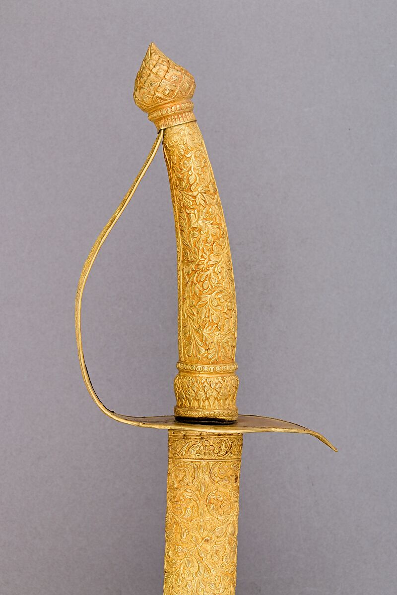 This sword was presented to The Metropolitan Museum of Art on June 8, 1967 by Their Majesties, King Bhumibol Adulyadej and Queen Sirikit of Thailand. The intricate goldsmith's work covering the hilt and scabbard date from the eighteenth century. The steel for the blade was smelted from the lateritic iron ores found at Tambon Ban Nam Ṕī, Amphur Trôn, in the province of Uttaraditth. The gift coincided with the exhibition "In the Presence of Kings," which featured treasures given by monarchs as personal gifts.
