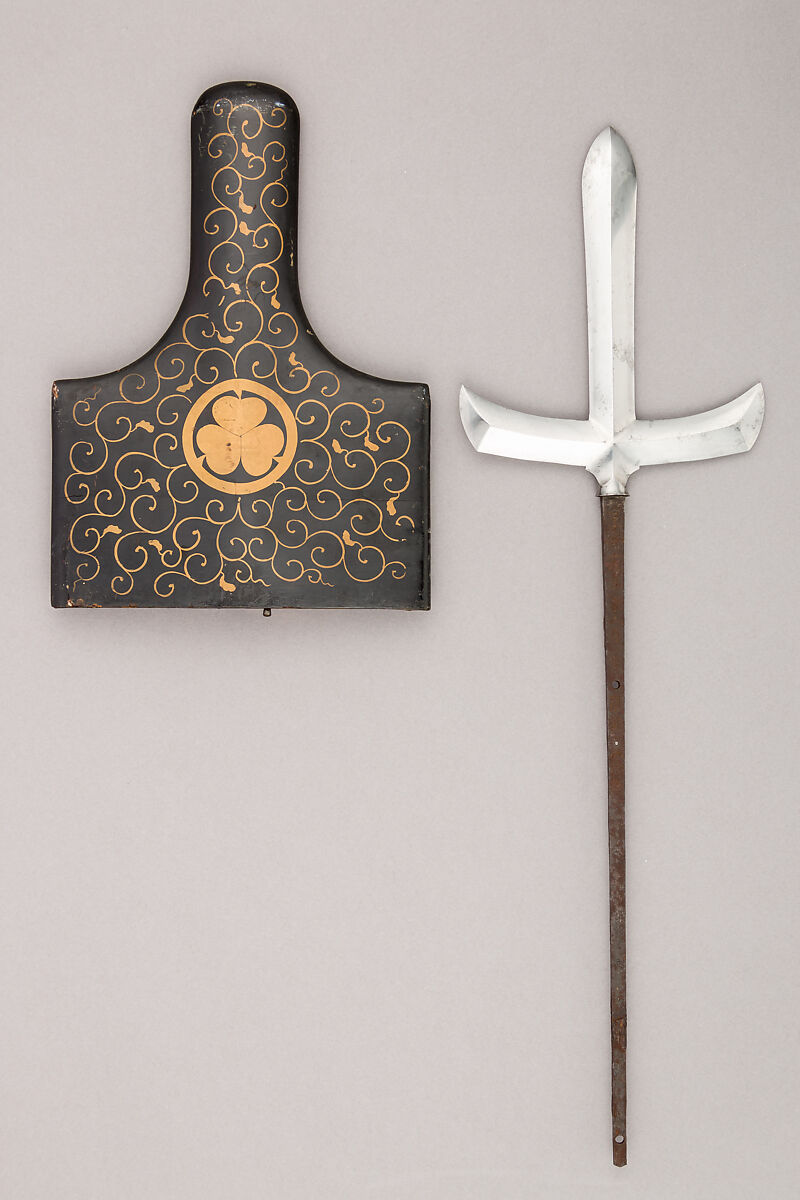 The use of spears became increasingly common during the late Muromachi period (1392–1573), a time of near-constant military conflict. Stabbing weapons to be used on foot, they typically measured around seven feet in length, allowing for maneuverability in close quarters. Spearheads varied in size and shape; this example is of a type with a cruciform structure. The sheath bears the crest (mon) of Matsudaira, a branch of the Tokugawa shogunate.