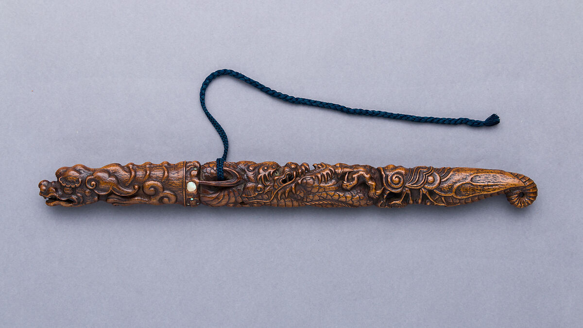 Carved in the round from a single piece of wood, this doctor’s sword (chatō) features an energetic assemblage of coiled dragons and animals. So-called doctor’s swords were carried by samurai in tea houses as stand-ins for metal swords, which were not allowed inside. Doctors, too, wore them for show in public. Ornate examples such as this one were greatly prized by collectors in Europe and America.
