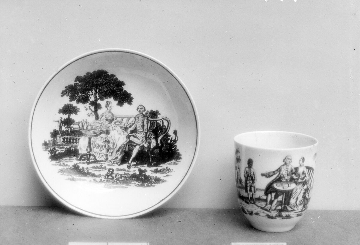 The "tea party" scene of the transfer-printed design is taken from an engraving by Robert Hancock (1730–1817). The cup is en suite with the transfer-printed porcelain saucer, 27.17.27.