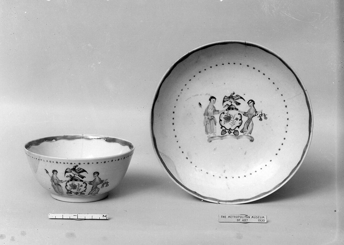 This cup, which forms a set with 30.120.372, features an adaptation of the arms of New York State. Figures of Liberty and Justice support a cartouche that contains a gilt flower spray instead of the rising sun.