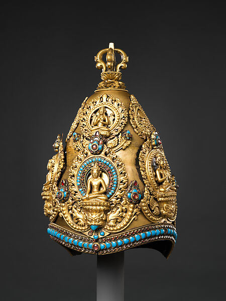 This crown's lavish use of mercury gilding conveys the appearance of a golden object, enhanced with generous settings of turquoise and rock crystal. It is surprising that all the appliqué elements, including the crowned Buddhas, were modeled from repoussé sheet metal, rather than having been cast. This is a tour de force of Newar metalworking.