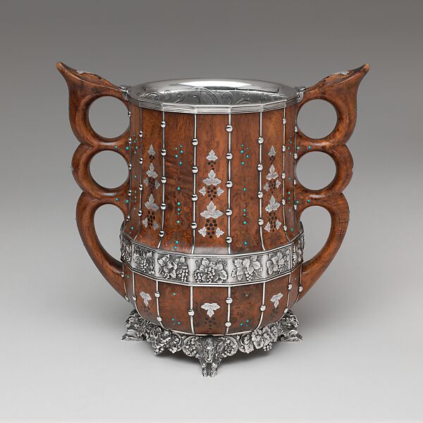 This cup combines silver with exotic wood, turquoise, and mother-of-pearl to striking and original effect. Described in Tiffany’s records as a “love cup,” it was designed for display at the World’s Columbian Exposition. The shape references Viking objects, while the ornament draws on a variety of foreign and domestic design sources.
