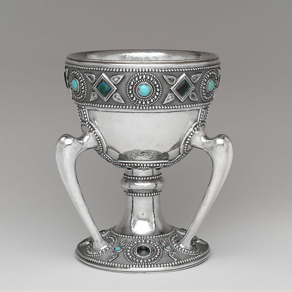 Louis Tiffany rarely worked in silver, the medium for which his father's firm is famous. The three-handled cup, or tyg, is a rare example marked by Tiffany Studios and presumably designed by Louis. The form evokes medieval metalwork but has been transformed by the addition of handles in the shape of animal bones. The applied jewel-like glass decoration is reminiscent of Native American or Mexican work in silver and turquoise.